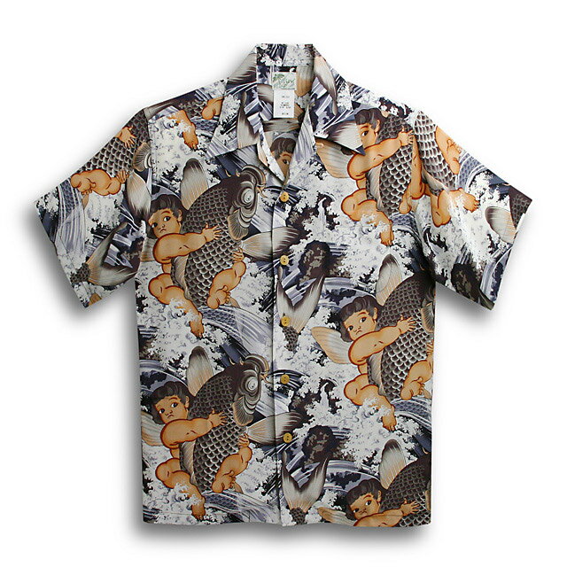 アロハシャツ・ララカイ(LALAKAI)|HL-025 天使と鯉|ブラック|メンズ|縮緬(ちりめん)シルク|薄手生地|半袖|アロハタワー(アロハシャツ販売) LALA KAI